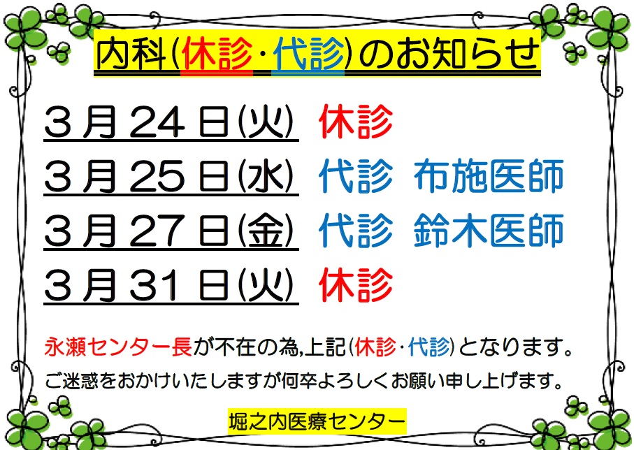 内科(休診・代診)のお知らせ