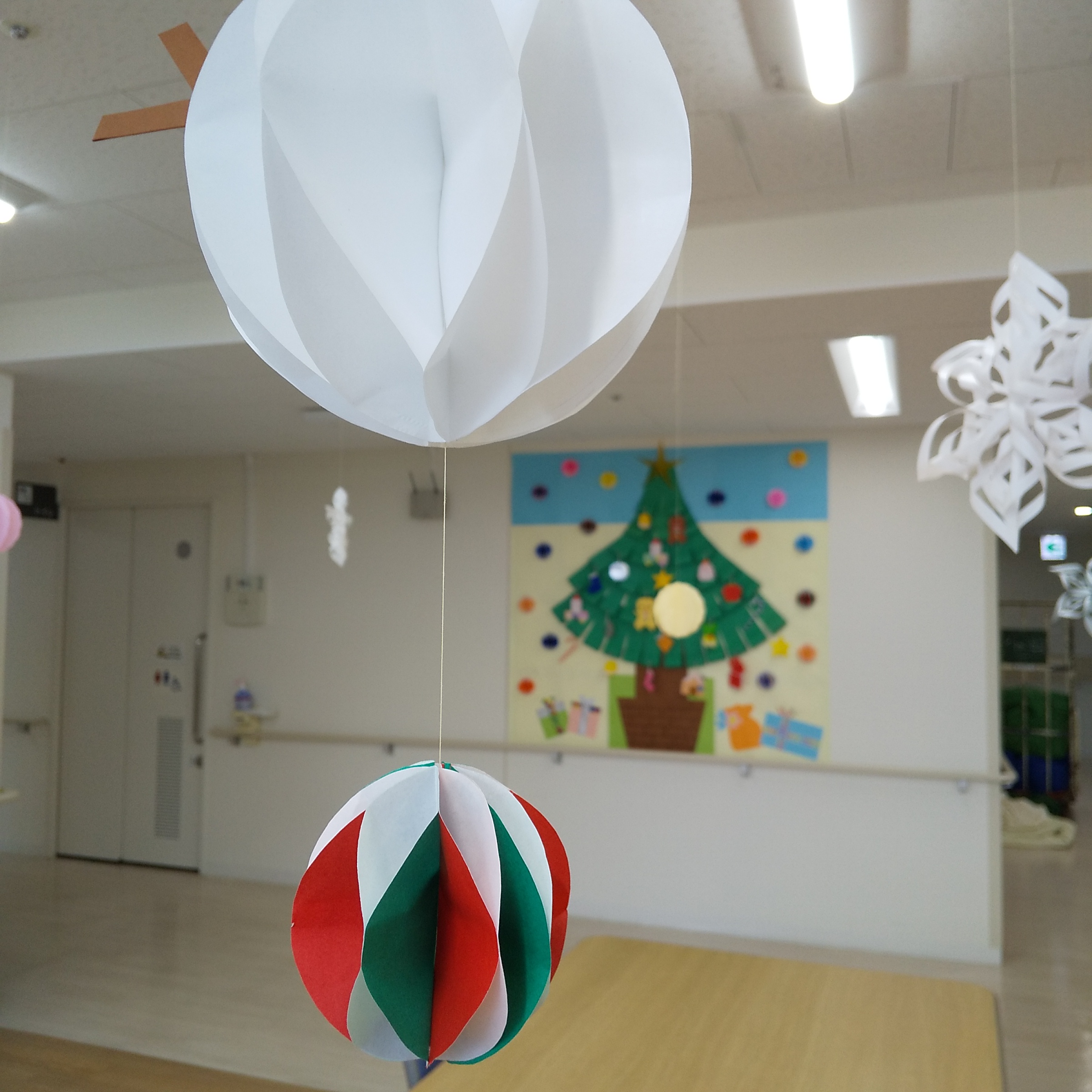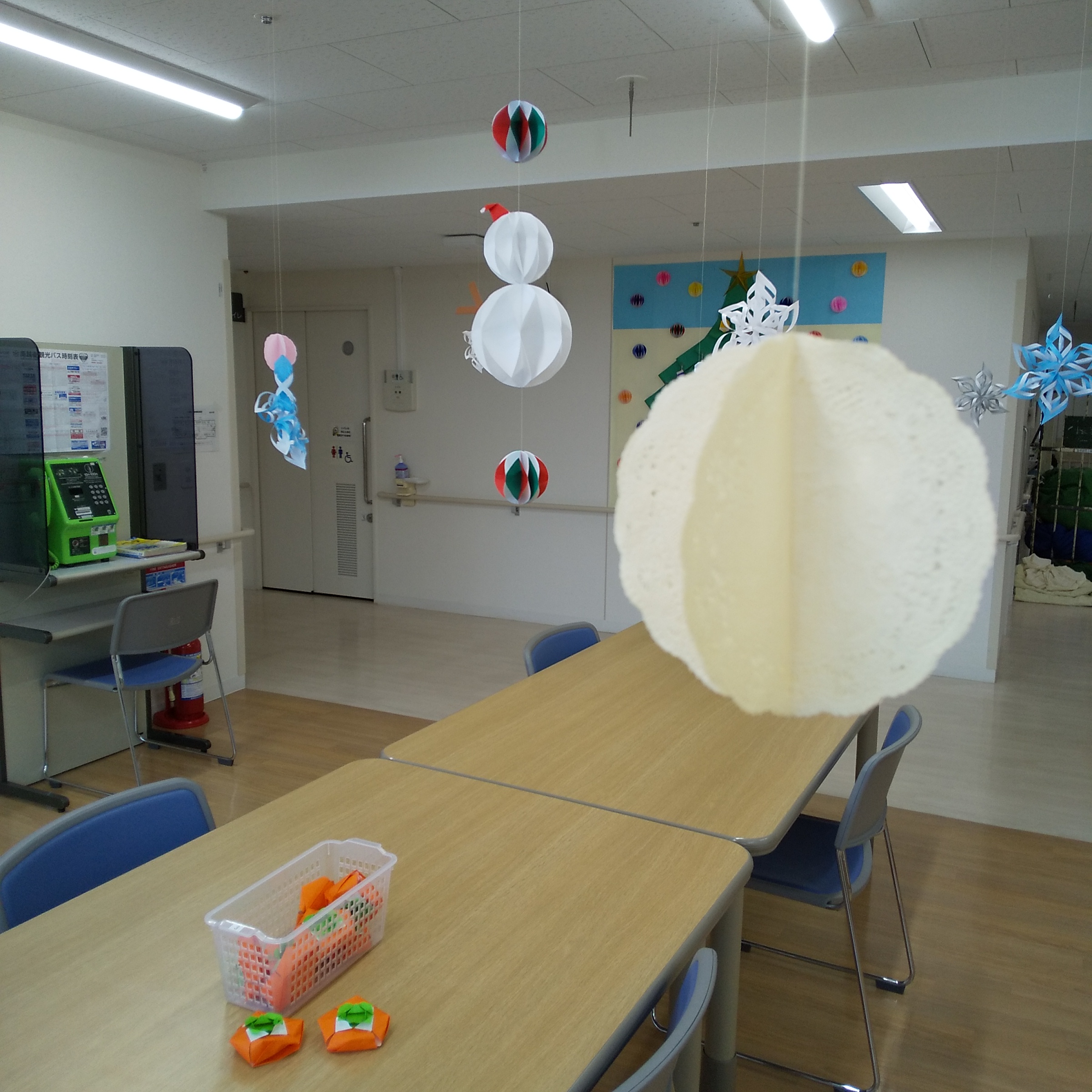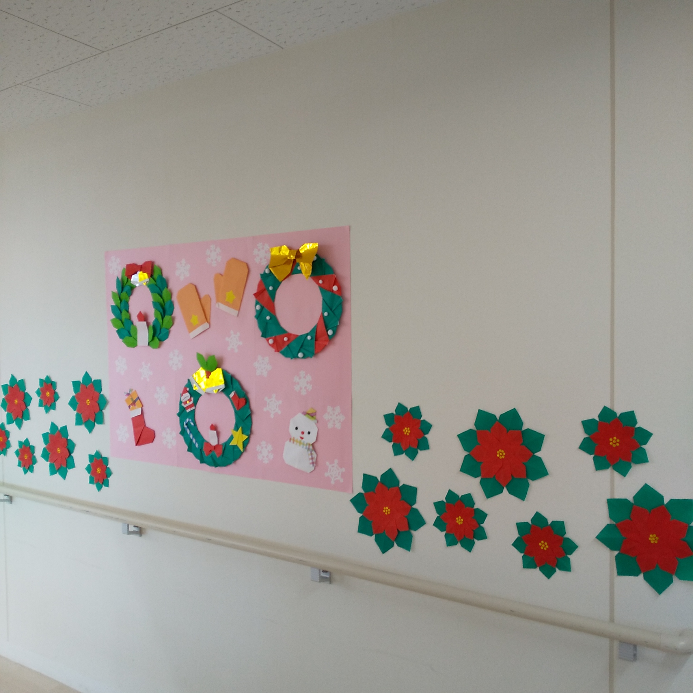内科病棟の廊下とデイルームが「秋」の装いから「クリスマス」にバージョンアップしました。天井から吊されている雪の結晶や壁に貼ってあるクリスマスツリーがとても素敵です。どれもケアワーカーさんの手作りです。